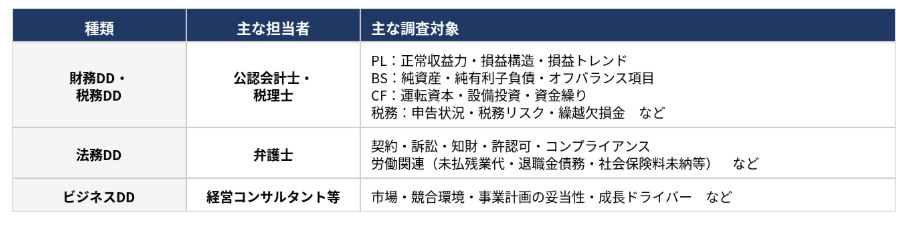 なお、中小企業が対象の案件では、ビジネスDDが省略されるケースも多く、財務DD・税務DDが調査の中心となることが一般的です。